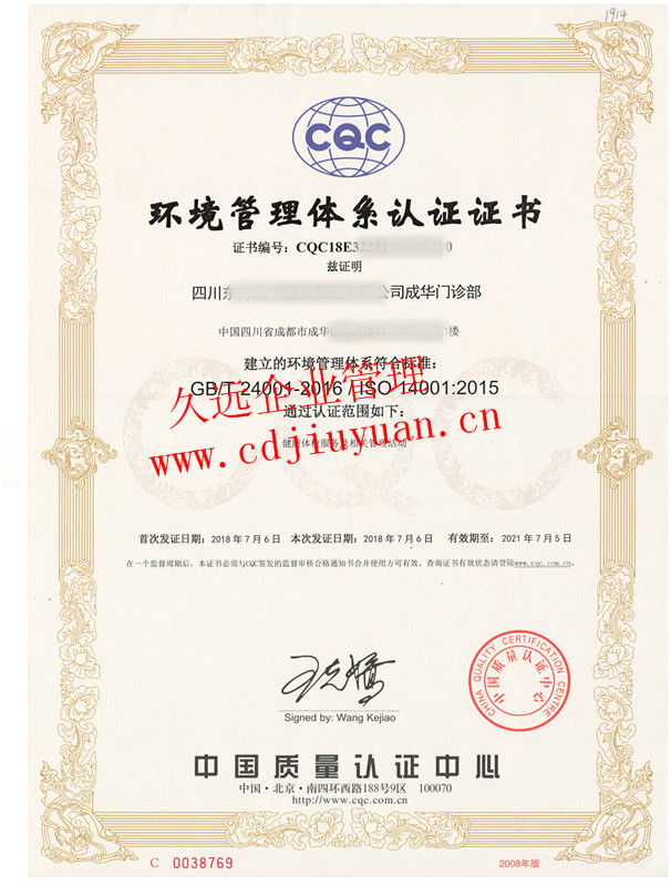 環(huán)境管理體系認(rèn)證證書