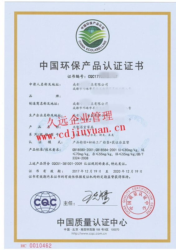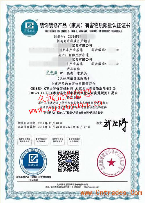 家具有害物質(zhì)限量認(rèn)證證書
