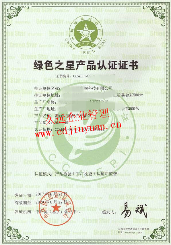 綠色之星產(chǎn)品認(rèn)證證書